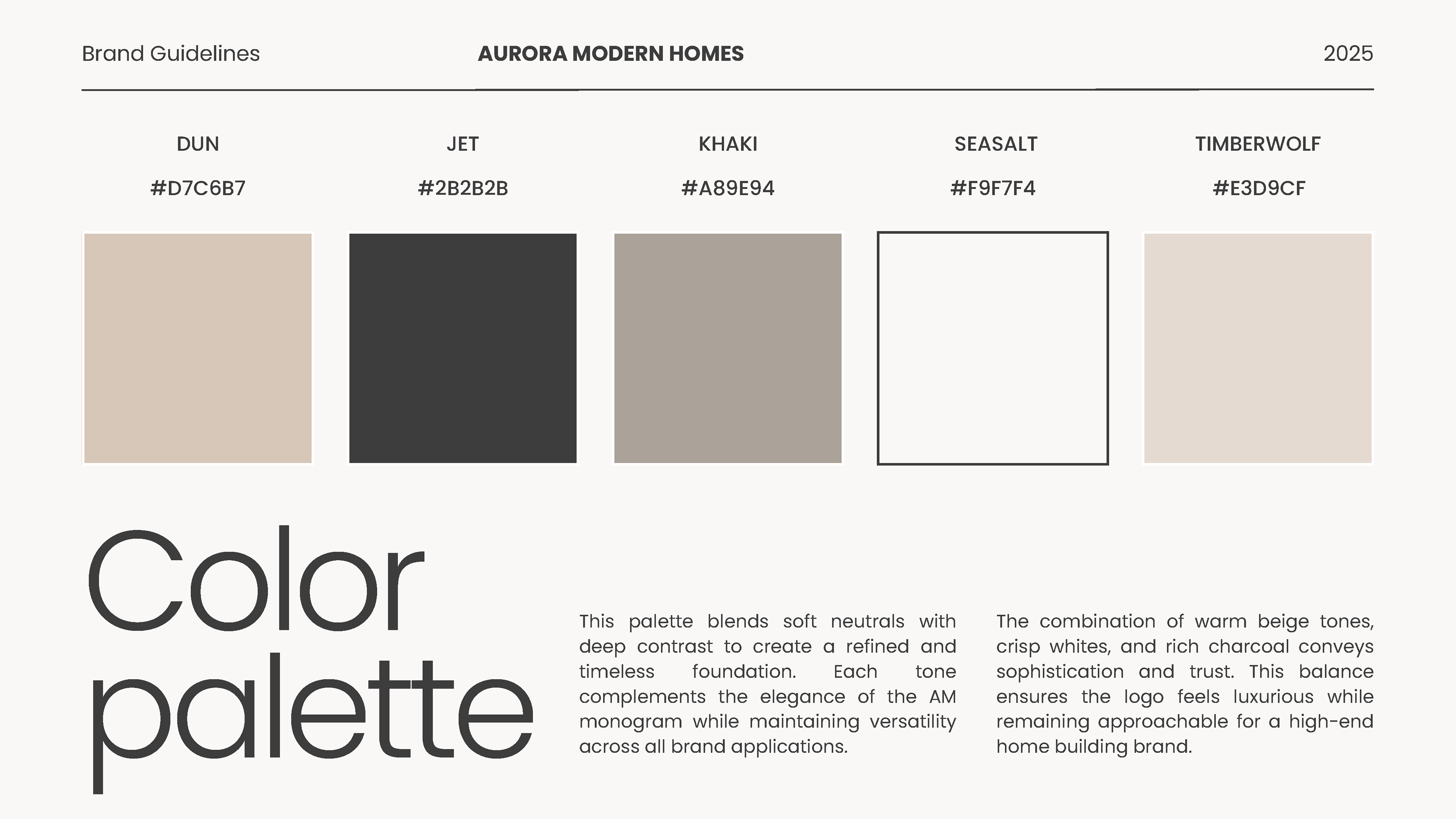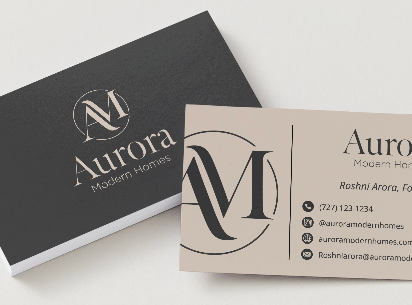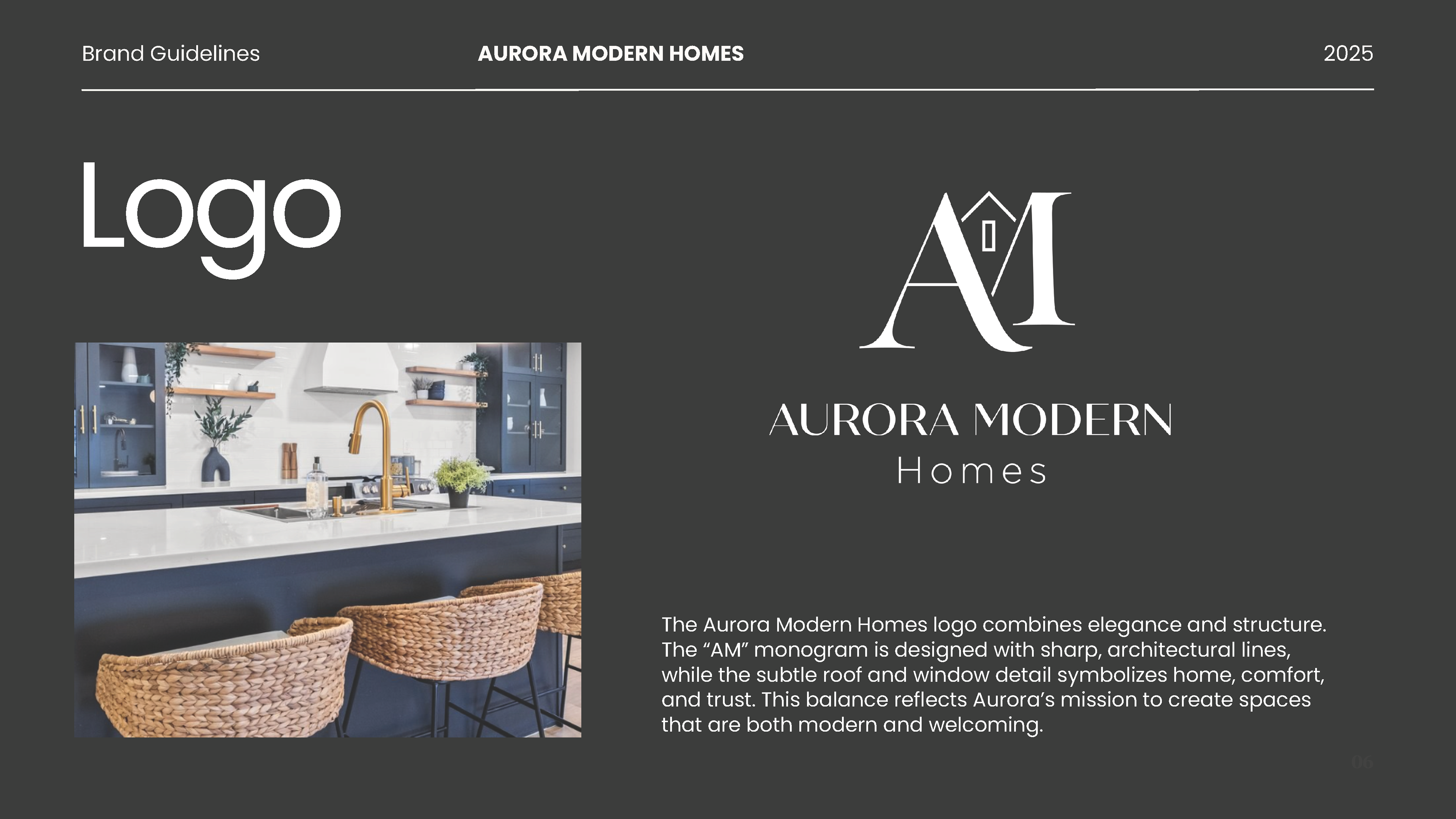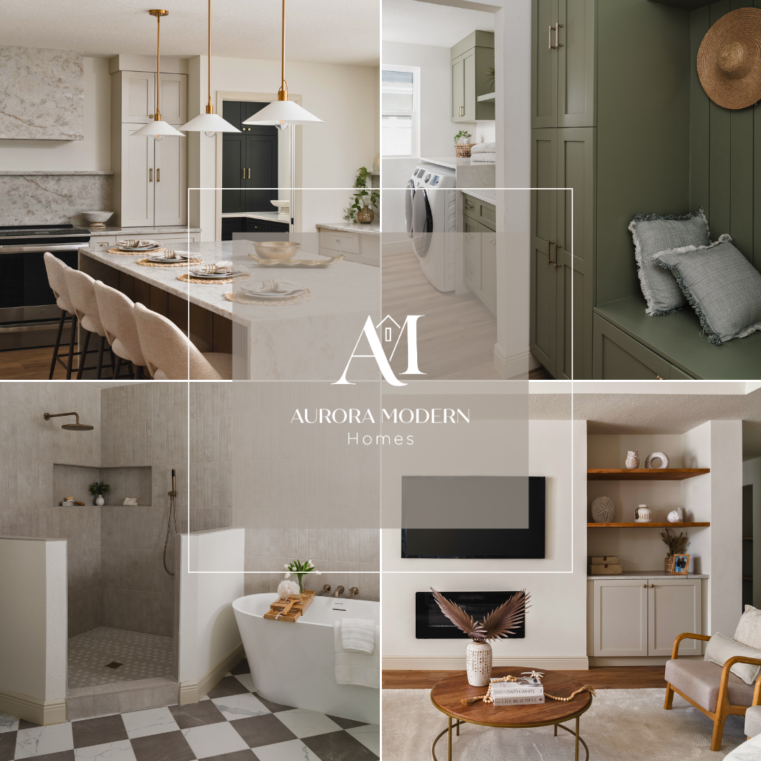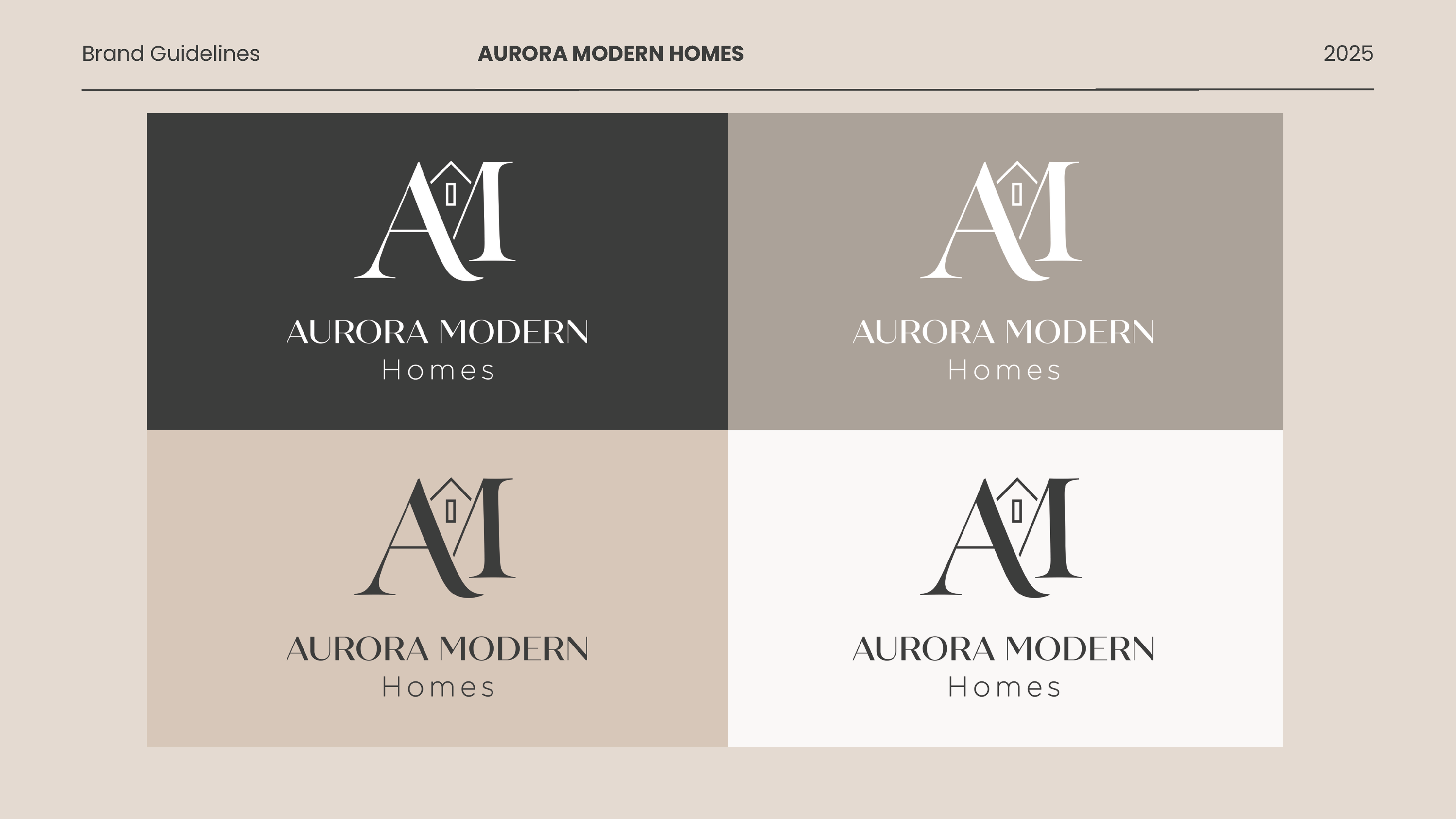 The Aurora Modern Homes identity blends sharp architectural lines with warm neutrals to reflect the brand’s focus on craftsmanship, comfort, and modern elegance.